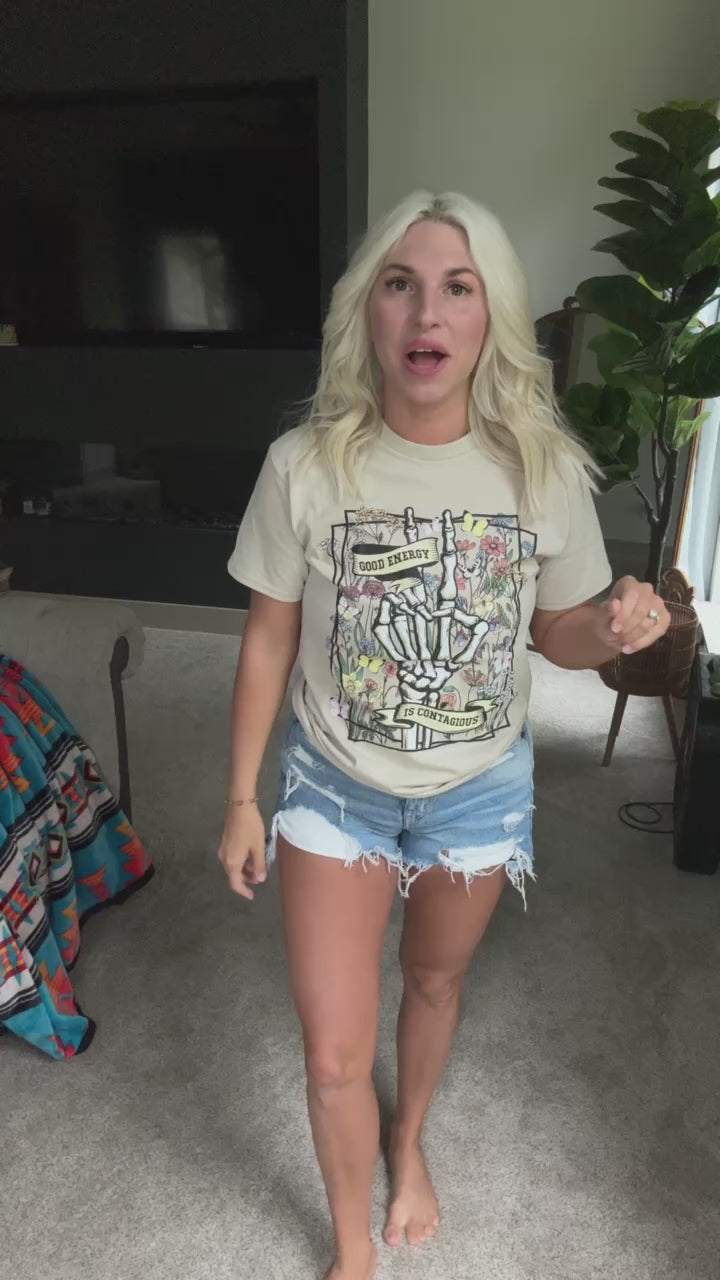 Spread good vibes with our "Good Energy Is Contagious" graphic tee. Made with soft, high-quality fabric, this tee will keep you looking and feeling great. Join the positive movement and share good energy wherever you go. (You won't want to take this tee off!)